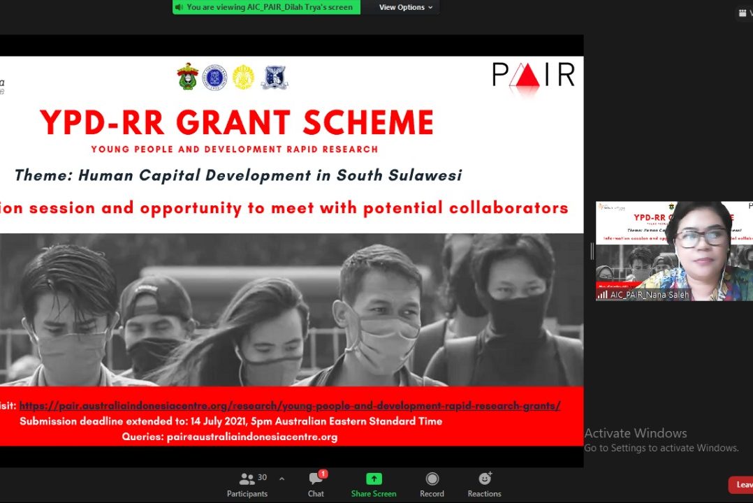 Australia-Indonesia Center menghadirkan salah satu skema hibah dalam program Partnership for Australia-Indonesia Research (PAIR) yakni Young People and Development Rapid Research (YPD-RR) dengan tema “Human Capital Development in South Sulawesi”. Kegiatan sosialisasi berlangsung pukul 13.30 Wita secara virtual melalui aplikasi zoom meeting, Rabu (30/06).