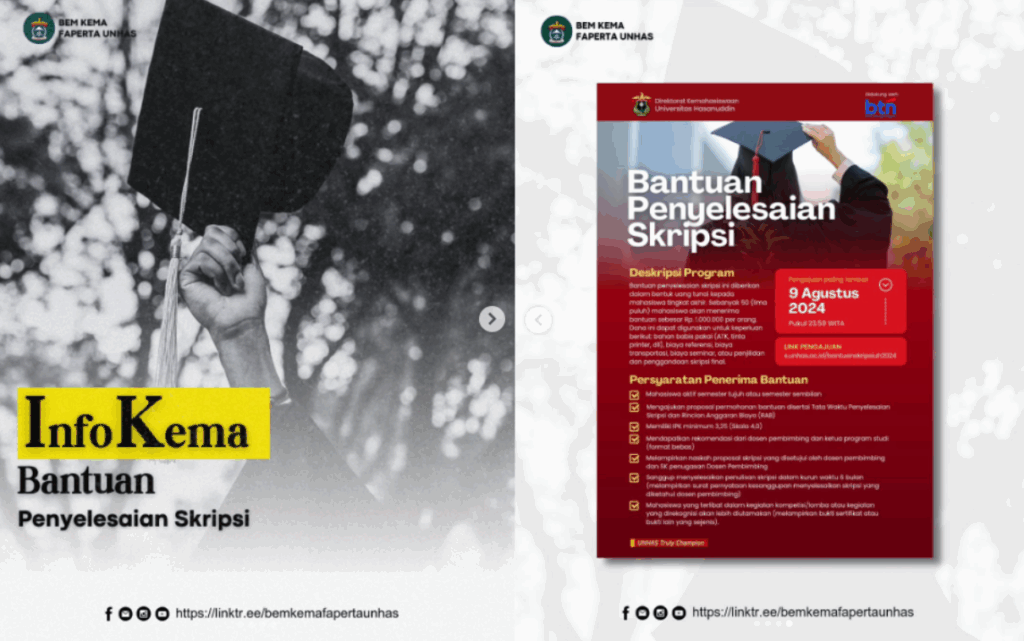 Bantuan penyelesaian skripsi ini diberikan dalam bentuk uang tunai kepada mahasiswa tingkat akhir. Sebanyak 50 (lima puluh) mahasiswa akan menerima bantuan sebesar Rp. 1.000.000 per orang. Dana ini dapat digunakan untuk keperluan berikut: bahan habis pakai (ATK, tinta printer, dll), biaya referensi, biaya transportasi, biaya seminar, atau penjilidan dan penggandaan skripsi final.