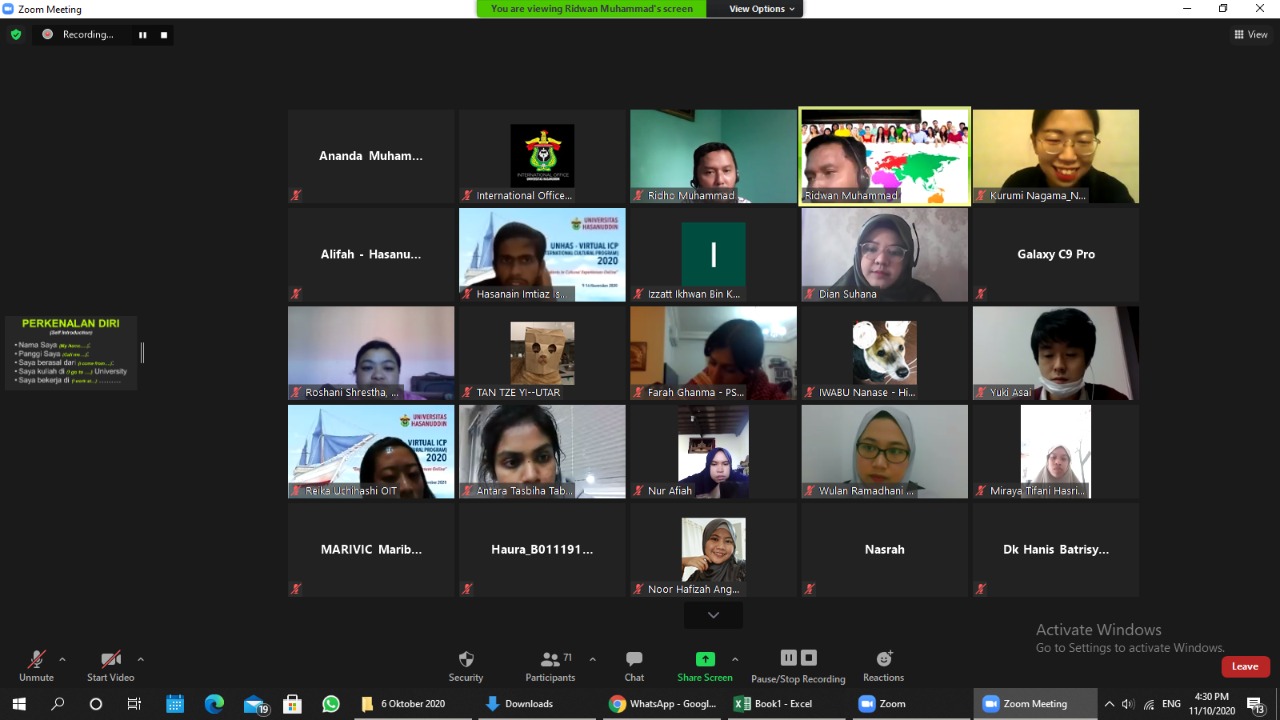 Hari kedua penyelenggaraan International Culture Program (ICP) batch II yang diselenggarakan oleh Kantor Urusan Internasional Universitas Hasanuddin, para peserta dari 18 negara memperoleh materi mengenai Bahasa Indonesia. Kegiatan ini berlangsung mulai pukul 16.00 WITA secara virtual melalui aplikasi zoom meeting, Selasa (10/11).