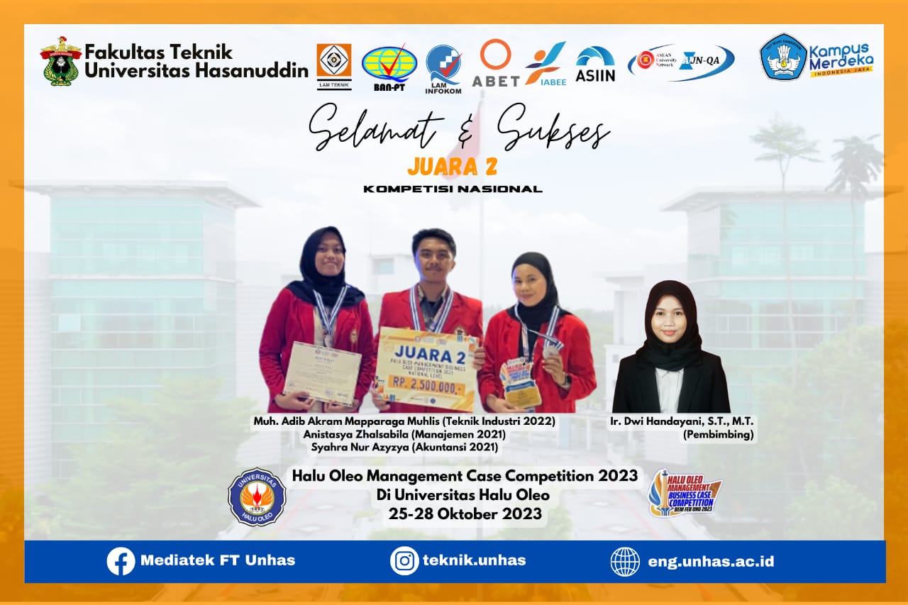 Delegasi Universitas Hasanuddin meraih juara dua di kompetisi Halu Oleo Management Business Case Competition. Lomba ini diselenggarakan oleh BEM Fakultas Ekonomi dan Bisnis Universitas Halu Oleo, yang dilaksanakan selama tiga hari, dari 25 Oktober hingga 27 Oktober 2023 di Universitas Halu oleo, Kendari.
