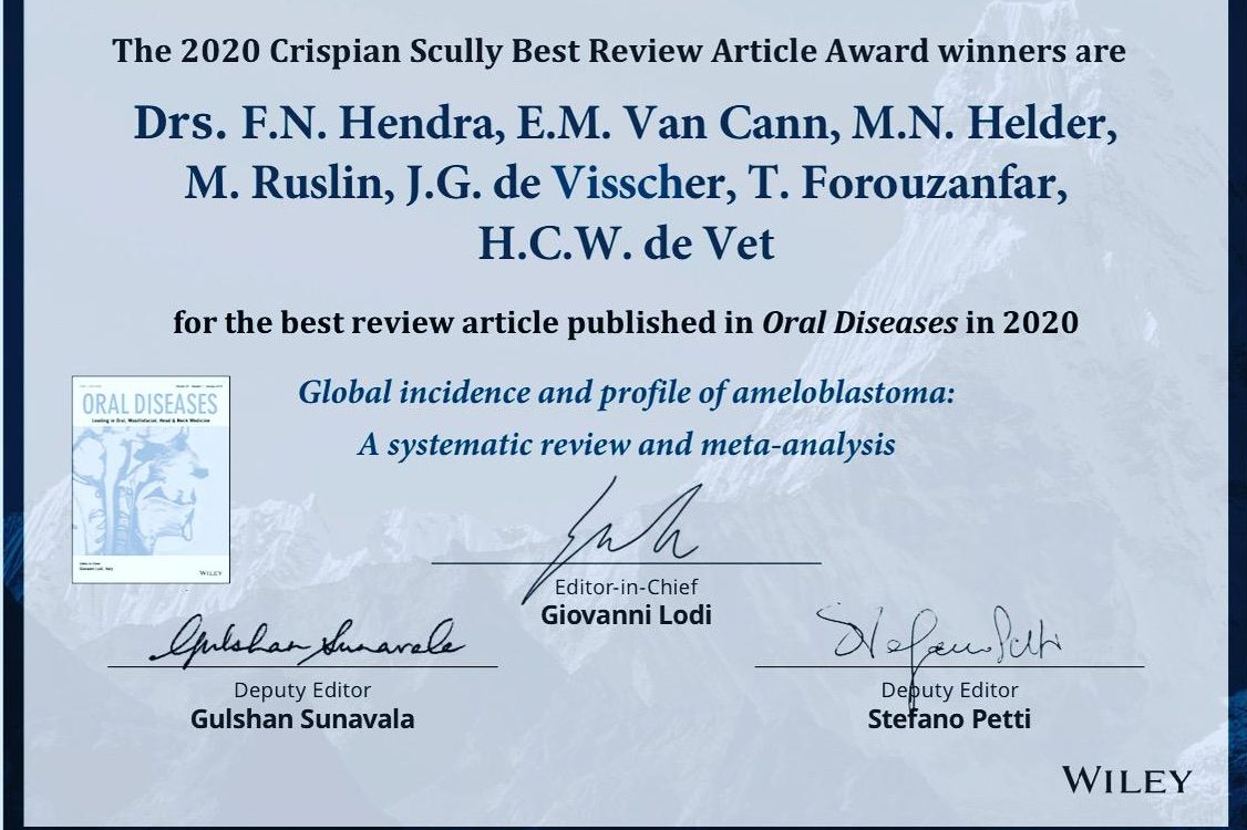 Artikel yang meraih penghargaan adalah “Global incidence and profile of ameloblastoma: A systematic review and meta‐analysis”, yang ditulis secara kolaborasi oleh Faqi Nurdiansyah Hendra, Ellen M. Van Cann, Marco N. Helder, Muhammad Ruslin, Jan G. de Visscher, Tymour Forouzanfar, dan Henrica C. W. de Vet. Para penulis lain merupakan peneliti dari VUmc Amsterdam.