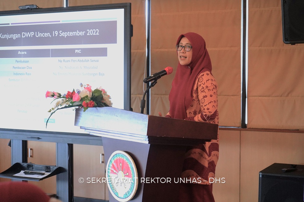Dalam sambutannya, Ny. Nilla Mayangsari Ruslin menyampaikan terima kasih dan apresiasinya kepada DWP Universitas Cendrawasih yang telah mengunjungi Unhas dalam rangka mempererat silaturahmi antar pengurus serta saling bertukar informasi dan pengalaman terkait keterlibatan atau peran DWP pada setiap kegiatan kampus.