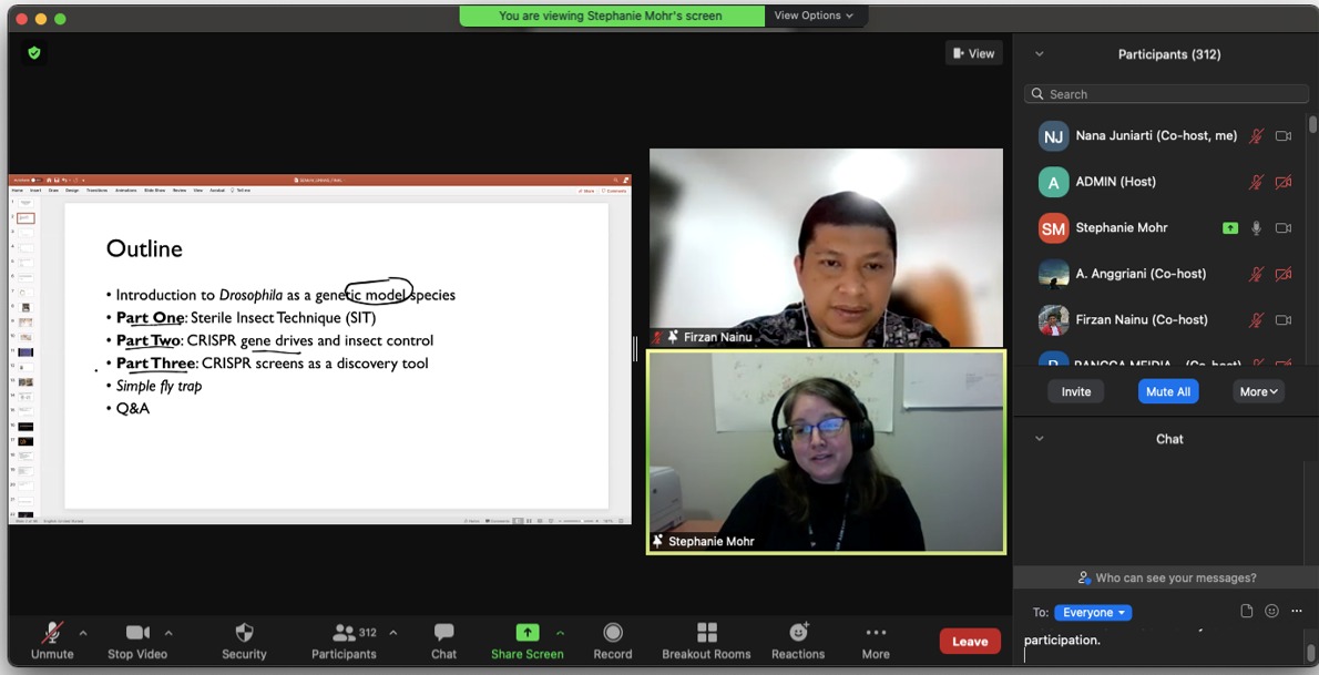 The Faculty of Pharmacy Unhas invited a guest lecturer, Dr Stephanie Mohr, from Biological and Biomedical Sciences, Harvard Medical School. The guest lecture discussed “Utilization of Genetic Modification Technology” called CRISPR-Cas9, especially in the animal model fruit fly (Drosophila melanogaster). The activity started at 19.00 WITA (08.00 USA Time) and was conducted online through the Zoom meeting application on Wednesday (17/11).