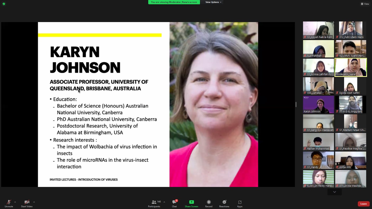 The Faculty of Pharmacy, Universitas Hasanuddin, held a guest lecture by presenting Professor Karyn Johnson from the School of Biological Sciences, The University of Queensland, Brisbane, Australia. He is a virologist and expert researcher in the field of genetics. The activity took place at 10.00 WITA virtually through the Zoom meeting application on Thursday (14/10).