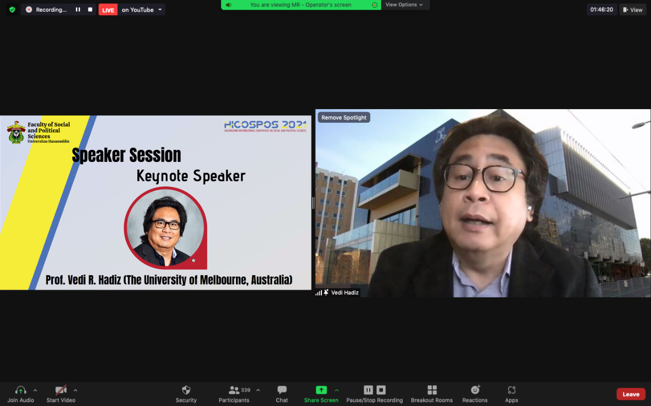The keynote speakers presented were Prof. Dr. Dwia Aries Tina Pulubuhu, MA (Professor of Sociology and the Rector of Universitas Hasanuddin) and Prof. Vedi R. Hadiz (the University of Melbourne, Australia).