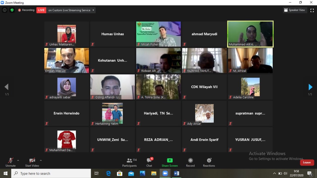 Laboratorium Kebijakan dan Kewirausahaan Fakultas Kehutanan Universitas Hasanuddin menyelenggarakan talk series edisi pertama dengan tema “Tata Kelola Kehutanan: Responsifkah Terhadap Krisis?”. Kegiatan berlangsung pukul 10.00 Wita secara virtual melalui aplikasi zoom meeting dan live streaming di kanal youtube Fakultas Kehutanan Unhas, Rabu (22/07).