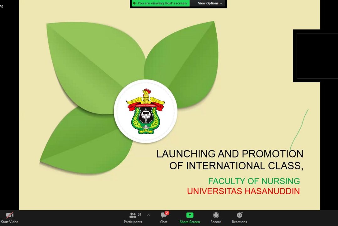 Kegiatan peluncuran Kelas Internasional Fakultas Keperawatan Unhas berlangsung mulai pukul 08.00 Wita secara virtual melalui aplikasi zoom meeting, Senin (03/05).