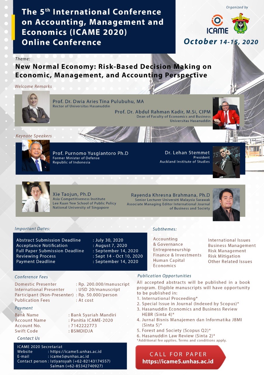 Fakultas Ekonomi dan Bisnis (FEB) Universitas Hasanuddin akan kembali menyelenggarakan konferensi internasional bertajuk “International Conference Accounting, Management, and Economics (ICAME) 5th” dengan mengusung tema “New Normal Economy: Risk-Based Decision Making on Economics, Management, and Accounting Perspective”. Kegiatan dijadwalkan berlangsung Rabu dan Kamis (14-15/10) secara virtual melalui aplikasi zoom meeting.
