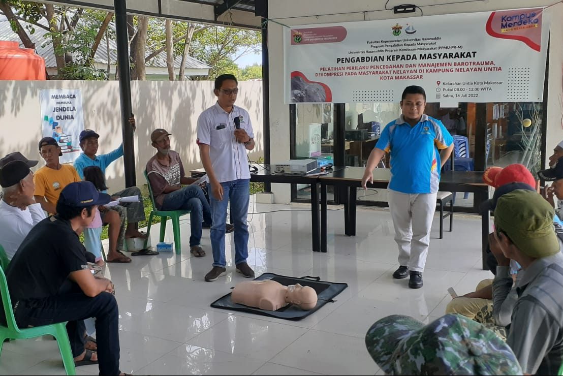 Fakultas Keperawatan Universitas Hasanuddin menyelenggarakan penyuluhan dan pelatihan perilaku pencegahan barotrauma kepada masyarakat nelayan di Kelurahan Untia, Makassar. Kegiatan yang merupakan salah satu agenda pengabdian kepada masyarakat tersebut berlangsung pada Sabtu (16/07).