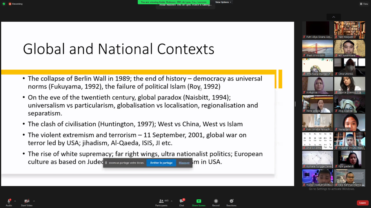 Andar Nabowo, DEA., Ph.D. Cand. from Ecole Normale Superieure de Lyon, France, was invited to present the topic on primordialism in multicultural societies like France and Indonesia.