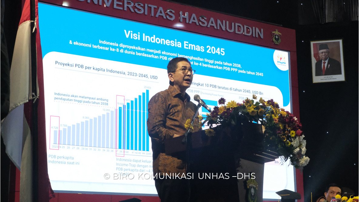 Ketua Kamar Dagang dan Industri Indonesia (Kadin) M. Arsjad Rasjid., P.M.,B.Sc., menyampaikan orasi ilmiah ”Visi Indonesia Emas 2045” pada perayaan puncak Dies Natalis ke-67 Universitas Hasanuddin dalam Upacara Senat Terbuka.