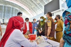 Mewakili Kementerian Kesehatan RI, Direktur Pelayanan Kesehatan Primer, drg. Saraswati, MPH., meninjau secara langsung pelaksanaan vaksinasi massal yang berlangsung di GOR JK Arenatorium, Kampus Unhas, Tamalanrea. Kunjungan berlangsung mulai pukul 10.00 Wita, Selasa (2/2).
