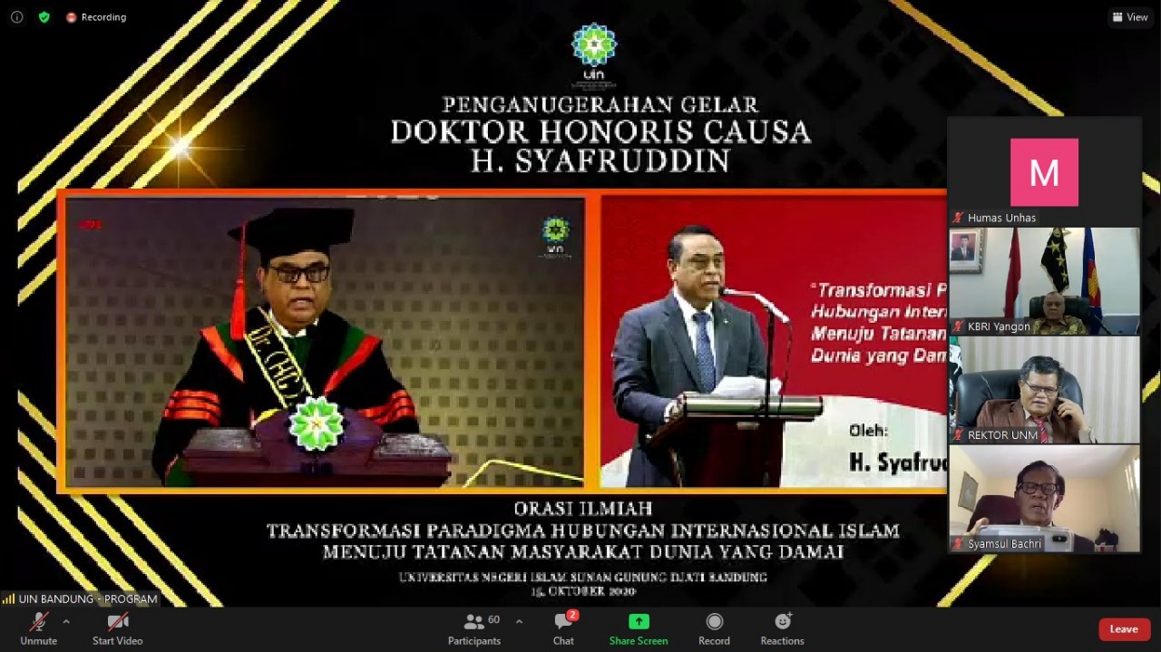Ketua Majelis Wali Amanat (MWA) Universitas Hasanuddin, Komjen Pol. Purn. Drs. H. Syafruddin, M.Si, meraih gelar doktor kehormatan (honoris causa) dari Universitas Islam Negeri (UIN) Sunan Gunung Djati, Bandung. Penganugerahan berlangsung dalam Sidang Senat Terbuka UIN Sunan Gunung Djati, Bandung, Kamis (15/10) mulai pukul 13.00 WIB.