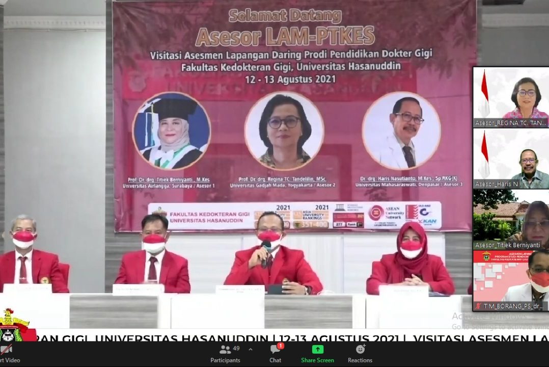 Lembaga Akreditasi Mandiri Perguruan Tinggi Kesehatan (LAM-PTKes) melaksanakan Asesmen Lapangan Daring (ALD) berupa visitasi dalam rangka akreditasi program Pendidikan Profesi Dokter Gigi (PPDG) pada Fakultas Kedokteran Gigi (FKG) Universitas Hasanuddin. Kegiatan berlangsung mulai pukul 09.00 Wita secara virtual melalui aplikasi zoom meeting, Kamis (12/08).