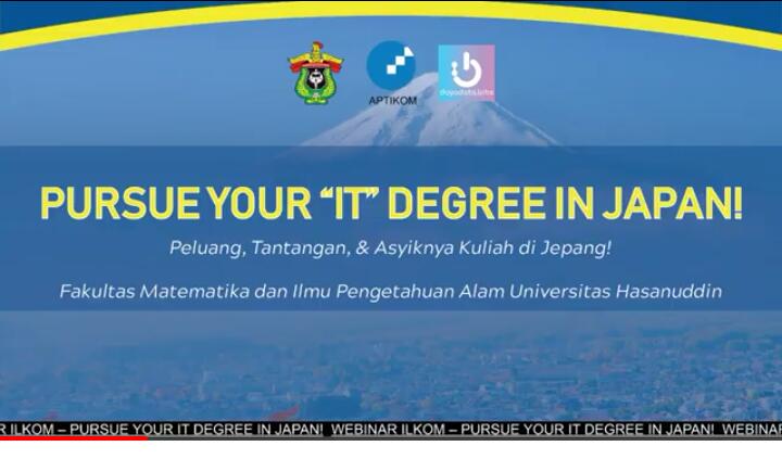 Universitas Hasanuddin melalui Fakultas Matematika dan Ilmu Pengetahuan Alam (FMipa) kerja sama dengan Asosiasi Pendidikan Tinggi Ilmu Komputer Indonesia (Aptikom) dan Dayadata.lobs menyelenggarakan webinar bertajuk “Pursue Your IT Degree in Japan”. Kegiatan ini mengangkat tema “Peluang, Tantangan dan Asyiknya Kuliah di Jepang”, berlangsung pukul 13.30 Wita secara virtual melalui aplikasi zoom meeting dan live streaming di kanal youtube, Sabtu (27/06).