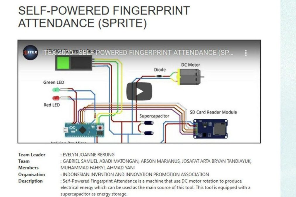 Untuk itu, SPRITE hadir sebagi inovasi mesin absensi sidik jari dengan memanfaatkan teknologi Self-Powered Dynamic System. Sehingga alat ini mampu mengkonversi energi kinetik berlebih menjadi energi yang digunakan untuk mendayai sistem itu sendiri. SPRITE mampu beroperasi tanpa membutuhkan suplai listrik dari luar.