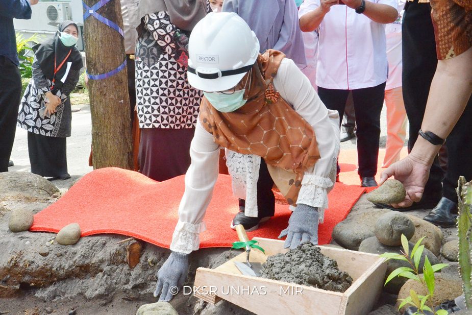 Rektor Universitas Hasanuddin, Prof. Dr. Dwia Aries Tina Pulubuhu, MA., meletakkan batu pertama sebagai tanda dimulainya proses pembangunan Masjid Rumah Sakit Pendidikan Unhas. Kegiatan berlangsung mulai pukul 10.00 Wita secara luring terbatas dengan penerapan protokol pencegahan Covid-19 di kawasan RSPTN Unhas, Kampus Unhas Tamalanrea, Makassar, Kamis (24/03).
