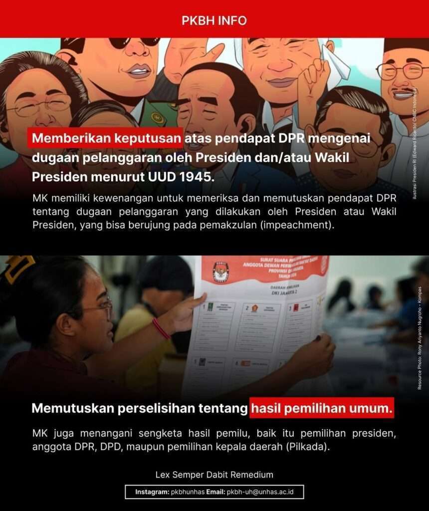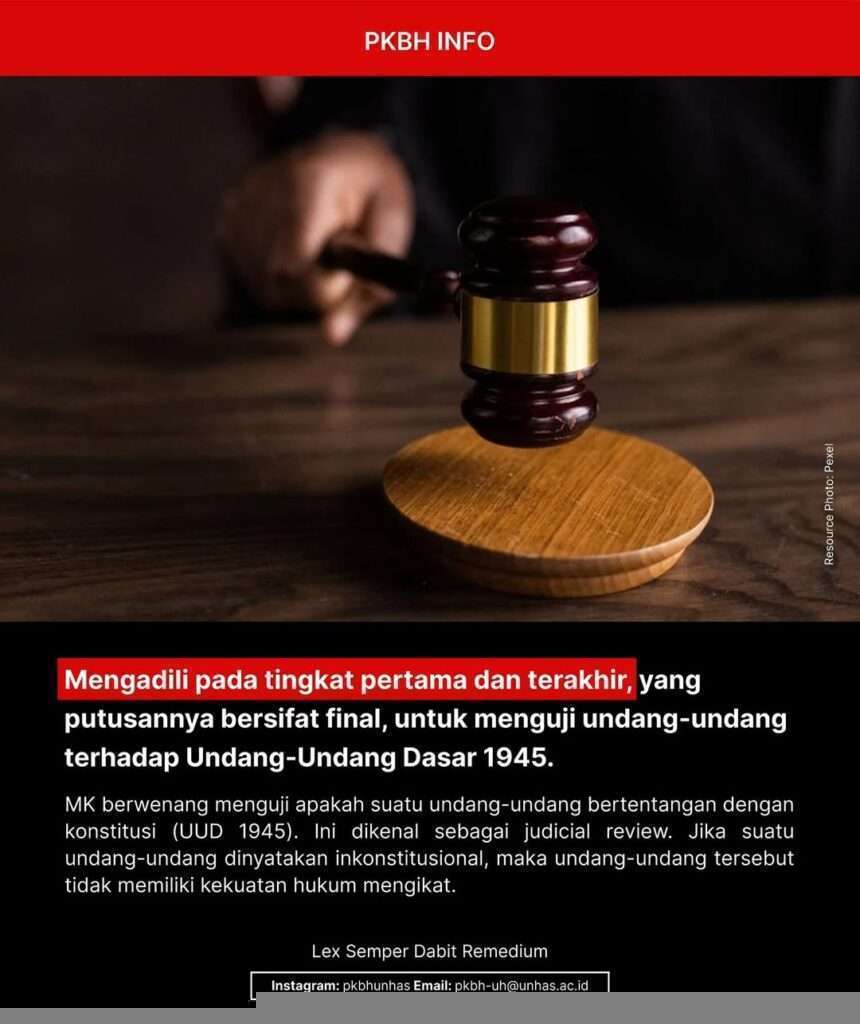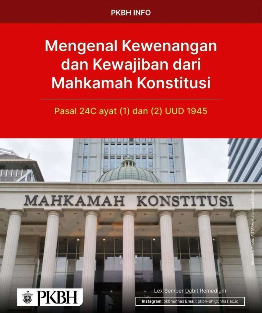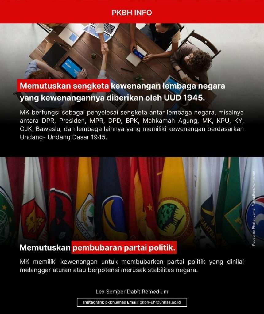 Kewenangan Mahkamah Konstitusi meliputi pengujian undang-undang terhadap UUD 1945, memutus sengketa kewenangan lembaga negara, memutus pembubaran partai politik, serta memutus perselisihan hasil pemilihan umum. Sebagai pilar penting dalam menjaga konstitusionalitas hukum di Indonesia, Mahkamah Konstitusi berperan dalam memastikan tegaknya supremasi hukum dan demokrasi.