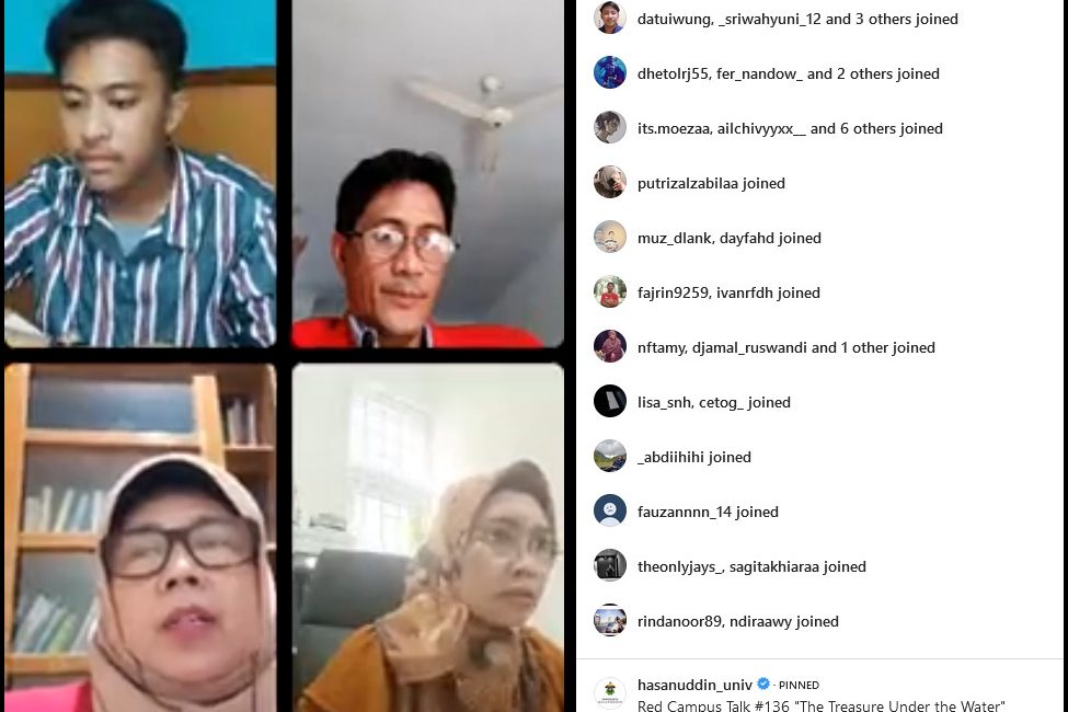 Edisi Red Campus Talk kali ini dipandu oleh Matrid (Student Volunteer Unhas) selaku host berlangsung lancar hingga pukul 17.30 Wita dan diikuti secara langsung oleh kurang lebih 100 follower instagram @hasanuddin_univ. (*/mir)