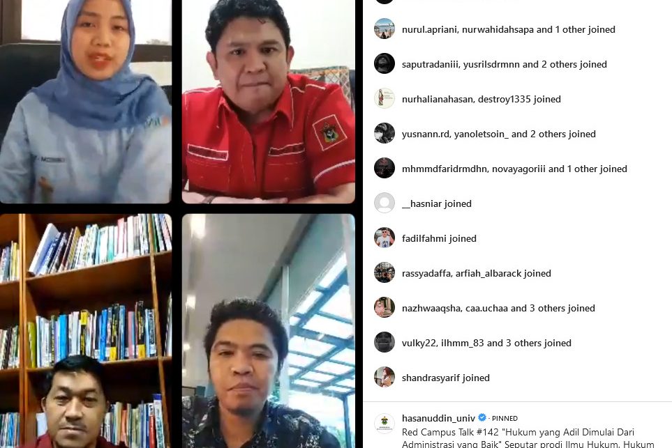 Edisi Red Campus Talk kali ini dipandu oleh Dewi (Student Volunteer Unhas) selaku host berlangsung lancar hingga pukul 17.00 Wita dan diikuti secara langsung oleh kurang lebih 100 follower instagram @hasanuddin_univ. (*/dhs)