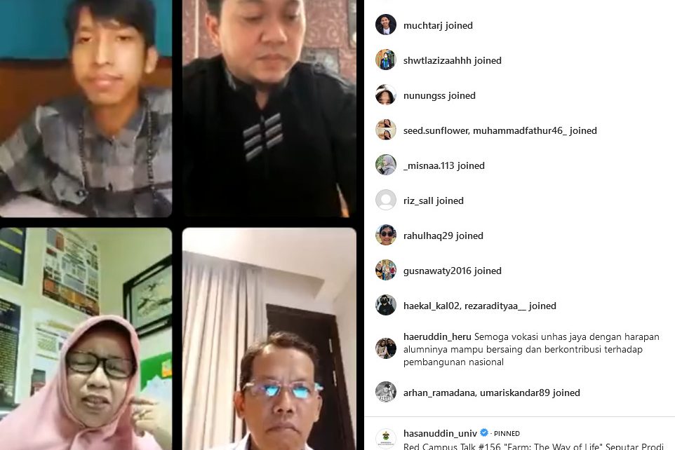 Edisi Red Campus Talk kali ini dipandu oleh Hajjan (Student Volunteer Unhas) selaku host berlangsung lancar hingga pukul 17.30 Wita dan diikuti secara langsung oleh kurang lebih 100 follower instagram @hasanuddin_univ.  (*/mir)