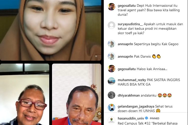 Direktorat Komunikasi Universitas Hasanuddin kembali menyelenggarakan program bertajuk Red Campus Talk edisi #32 dengan tema “Berbekal Bahasa Inggris Keliling Dunia Mencari Teman: Seputar Departemen Sastra Inggris dan Departemen Ilmu Hubungan Internasional Unhas”. Program ini berlangsung pukul 16.00 Wita secara live melalui akun instagram @hasanuddin_univ, Kamis (15/04)