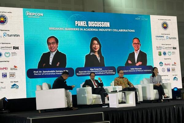 Dalam Second Panel Discussion bertema “Breaking Barriers in Academia–Industry Collaborations”, Rektor Unhas Prof. JJ, hadir bersama May-Fung Yeo (Associate Vice President, Centre for Career Readiness, Singapore Institute of Technology) serta Isdar Marwan (President Director, Mercer Indonesia).