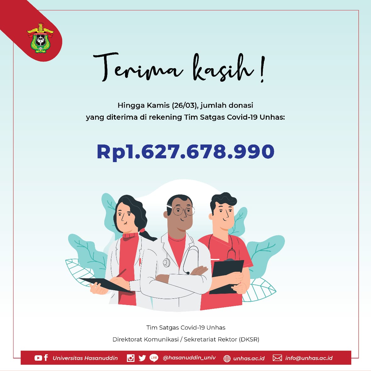 Hingga Kamis (26/3), jumlah bantuan yang diterima dari masyarakat telah mencapai Rp. 1.627.678.990,- bantuan dalam bentuk dana. Itu belum termasuk bantuan dalam bentuk material yang juga langsung diterima oleh Tim Satgas Covid-19 Unhas.
