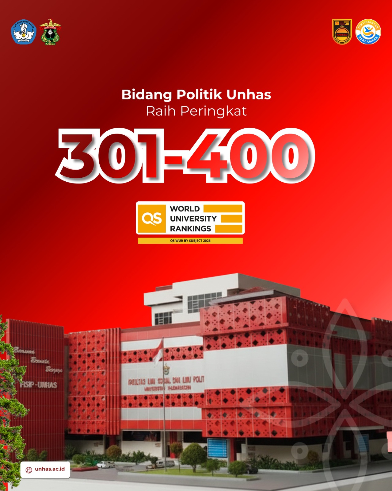 Dalam pemeringkatan terbaru tersebut, bidang Politics berhasil menempati peringkat 301–400 dunia, menandai pengakuan internasional terhadap kualitas pendidikan dan riset di lingkungan FISIP Unhas.