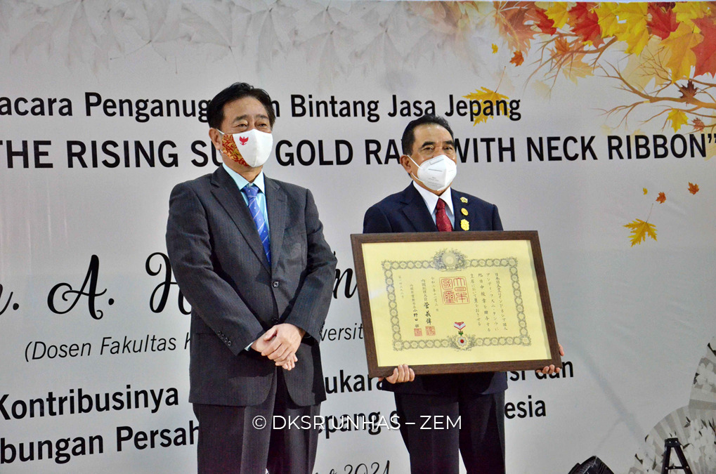 The Japanese government awarded a Service Star in the category of “The Order of The Rising Sun, Gold Rays With Neck Ribbon” to Prof. dr. A. Husni Tanra, Ph.D., Sp.An., a professor of the Universitas Hasanuddin of Faculty of Medicine. The Service Star was given a major role in increasing academic exchanges and friendly relations Japan-Indonesia.
