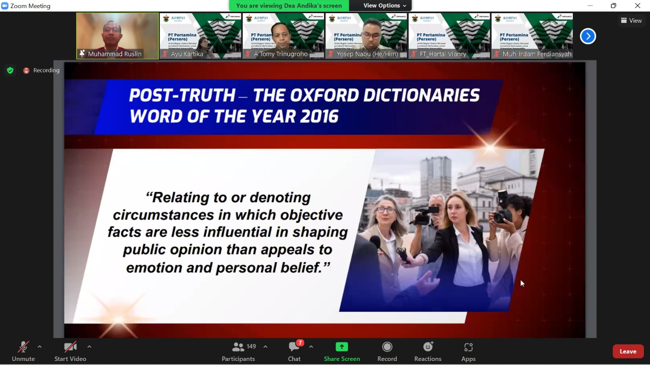 “Era post truth merupakan situasi di mana fakta yang objektif kalah berpengaruh dibanding emosi atau keyakinan seseorang. post truth di media sosial, fakta objektif kurang berpengaruh dalam membentuk opini publik karena lebih kuat emosi dan keyakinan pribadi. Untuk itu, pentingnya literasi digital untuk menghindari penyebaran berita yang tidak benar,” jelas Prof. Ruslin.