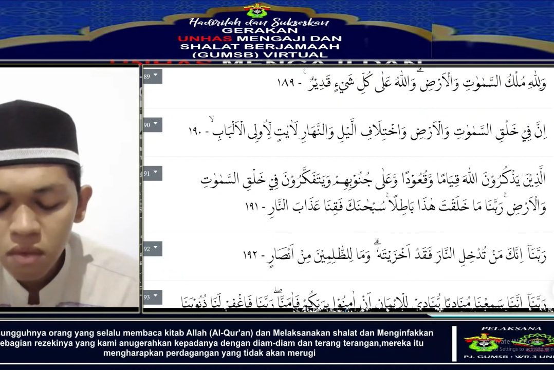 Universitas Hasanuddin kembali menyelenggarakan Gerakan Unhas Mengaji dan Sholat Berjamaah (GUMSB). Untuk kali ini, Fakultas Ilmu Budaya (FIB) bertindak sebagai host. Kegiatan yang menjadi agenda rutin Unhas setiap pekan berlangsung mulai pukul 15.30 Wita secara virtual melalui aplikasi zoom meeting, Selasa (29/03).