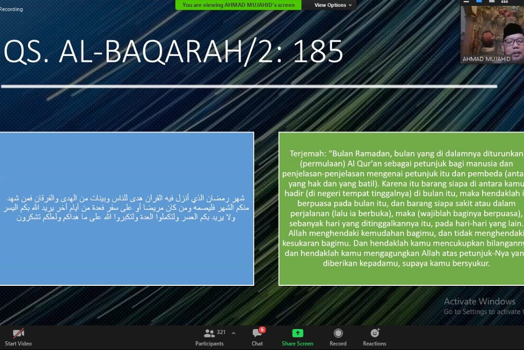 Merujuk pada makna QS. Al-Baqarah ayat 185 sebagai landasan utama dengan kata kunci ramadhan, Al-Quran, puasa dan takbirtullah. Kedatangan bulan Ramadhan, kata Ust. Mujahid, menjadi momentum baik untuk memperbaiki diri mengingat ramadhan berfungsi sebagai syahrul maghfirah atau bulan ampunan.