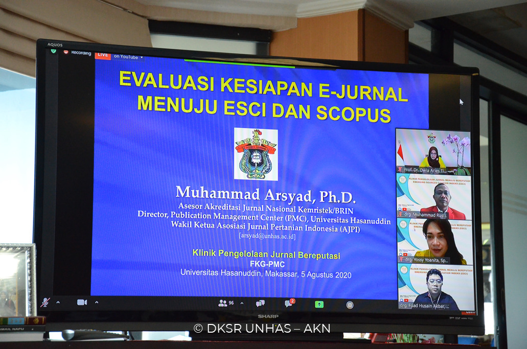 Universitas Hasanuddin melalui Klinik Pengelolaan Jurnal Fakultas Kedokteran Gigi (FKG) menyelenggarakan pelatihan bertajuk “Klinik Pengelolaan Jurnal Menuju Bereputasi Emerging Sources Citation Indeks (ESCI) & Manajemen Pengelolaan Jurnal Menuju Scopus”.