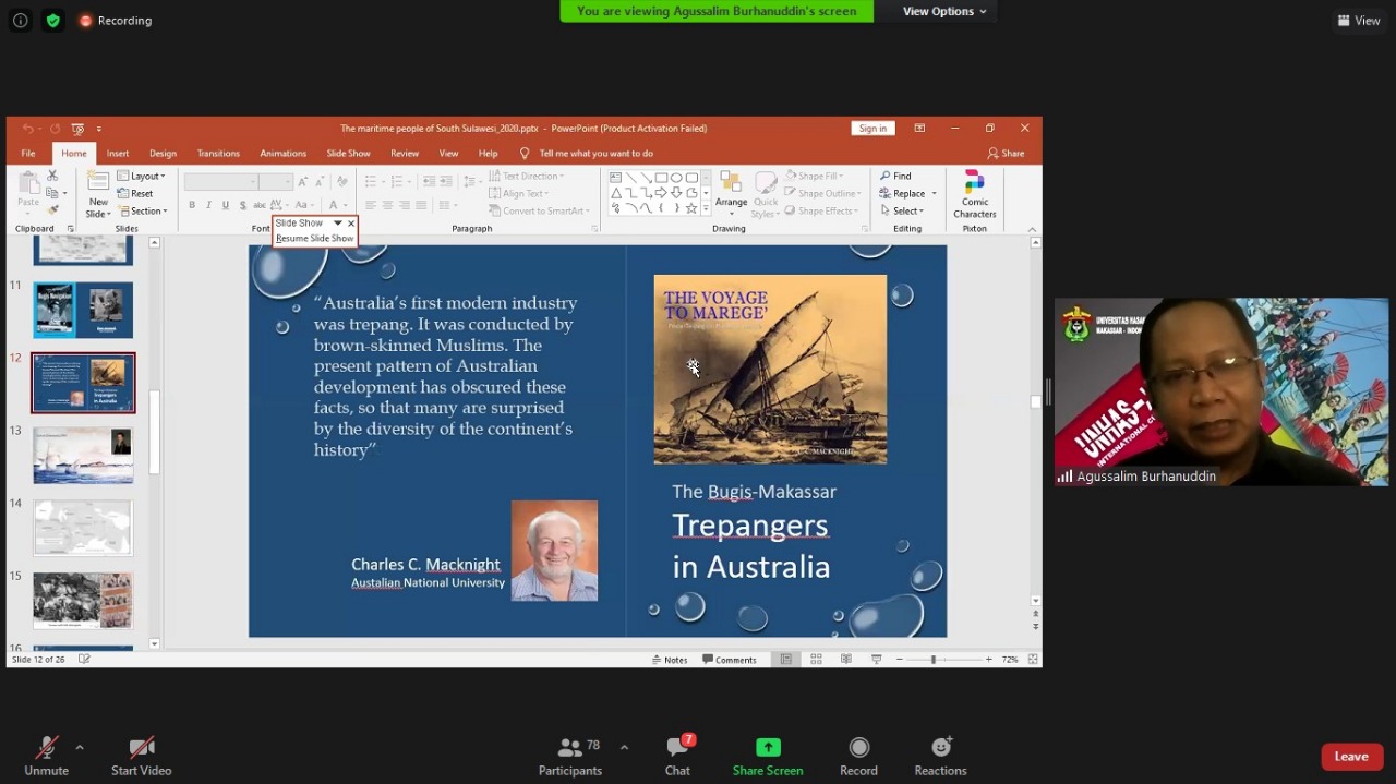 Pada penyelenggaraan International Culture Program (ICP) tahun 2020 hari kelima, Kantor Urusan Internasional (KUI) Universitas Hasanuddin sebagai penanggung jawab kegiatan memperkenalkan kepada para peserta yang berasal dari 22 Negara terkait sejarah petualangan masyarakat bahari di Sulawesi Selatan. Kegiatan dimulai pukul 08.30 Wita secara virtual melalui aplikasi zoom meeting, Jumat (09/10).