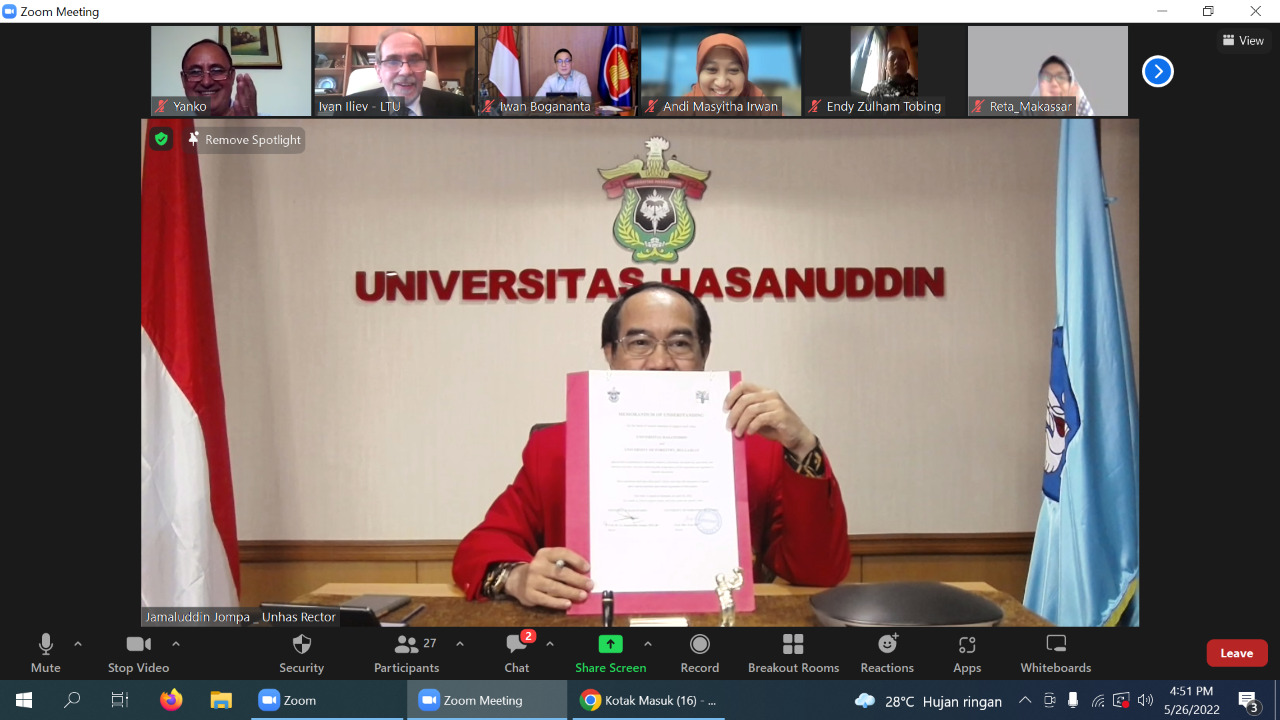 Universitas Hasanuddin (Unhas) and the University of Forestry, Bulgaria coincide to collaborate on the development of Tridharma Perguruan Tinggi (Three Pillars of Higher Education) including Education, Research, and Service. The collaboration was manifested in a Memorandum of Understanding (MoU) signed by the Rector of Unhas (Prof. Dr. Ir. Jamaluddin Jompa, M.Sc) and the Rector of the University of Forestry, Bulgaria (Prof. DSc. Ivan Hiev).