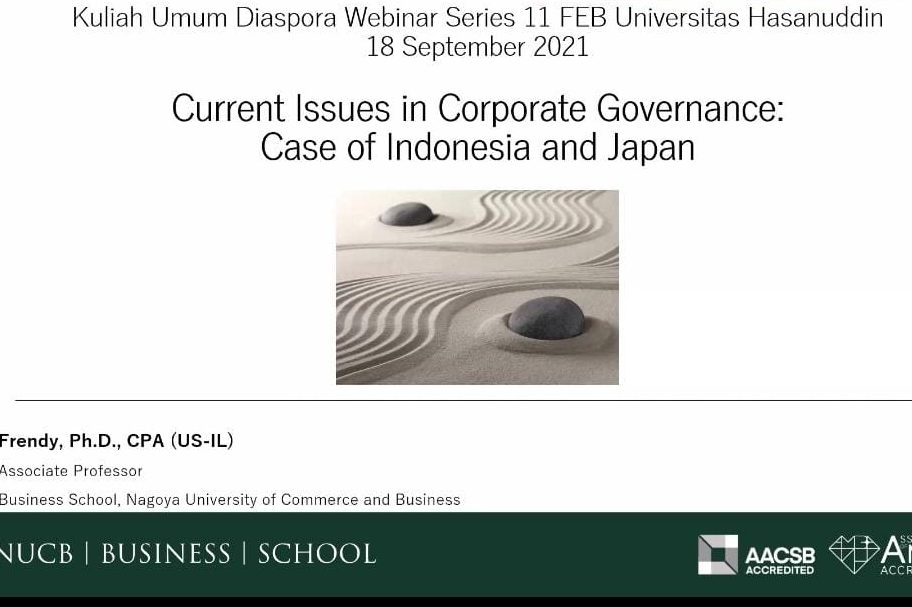 Fakultas Ekonomi dan Bisnis (FEB) Universitas Hasanuddin menyelenggarakan Webinar Diaspora dengan tema “Current Issues in Corporate Governance”. Kegiatan yang menghadirkan Frendy, PhD, CPA (US-IL) dari Nagoya University of Commerce and Business, Japan, sebagai narasumber. Acara ini berlangsung mulai 09.00 Wita secara virtual melalui aplikasi zoom meeting, Sabtu, (18/09).